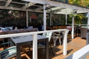 A vegan friendly cafe with a dog friendly deck area that offers shade for pups.Â