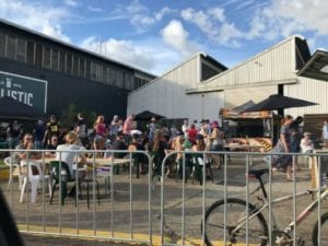 A modern industrial building featuring high ceilings and concrete flooring. There is picnic- style tables, tall tables with stools, and a view of the beer brewing facilities. There are 12 taps with beer […]